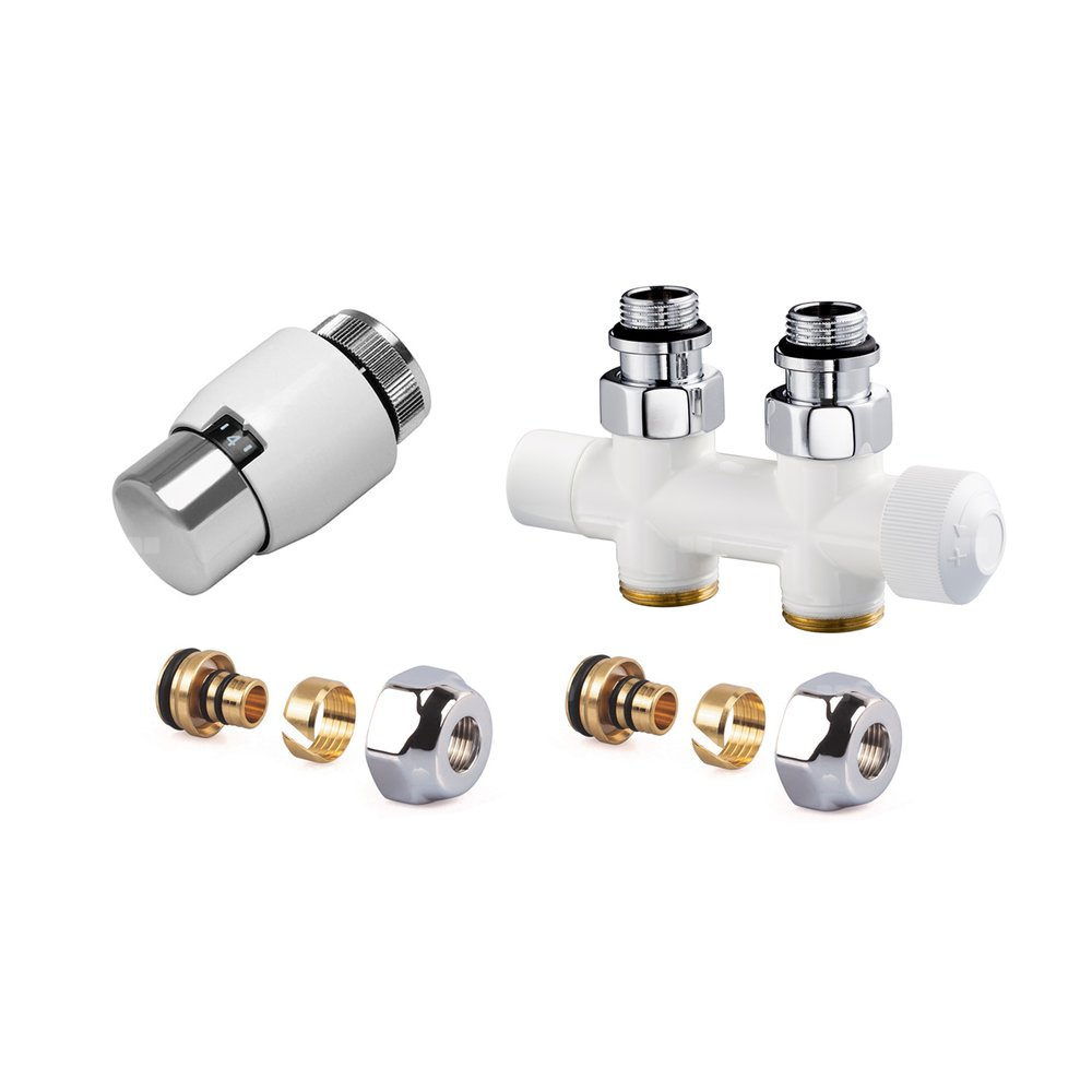 Zestaw BIAŁY do grzejników dolnozasilanych: głowica Thera-200 (biała/chrom) T4021, zawór podwójny, prosty, V2881DSL15A + 2x złączka do rur wielowarstwowych FEM24M16X2