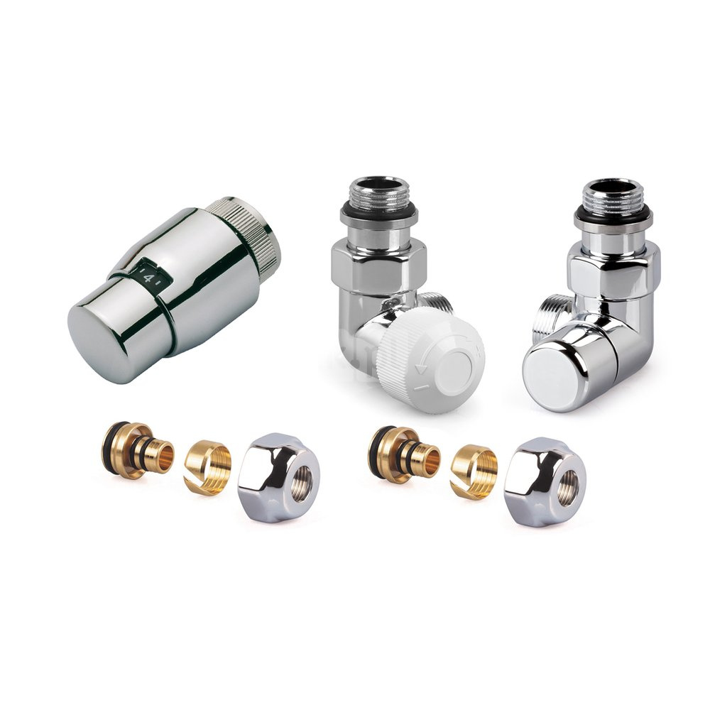 Zestaw CHROM do grzejników bocznozasilanych: głowica Thera-200 (chrom/chrom) T4221 + Zawór termostatyczny, chrom, narożny, lewy, 1/2" V2082LSL15A + zawór powrotny narożny, prawy, 1/2" V2482R0015A + 2x złączka do rur wielowarstwowych FEM24M16X2