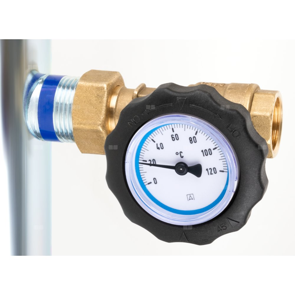 Zawory odcinające ze zintegrowanymi termometrami do kontroli temperatury medium na każdym przyłączu.