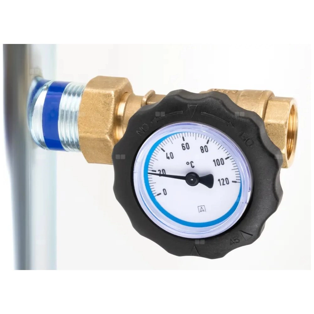 Zawór zwrotny wbudowany w zawór odcinający z niebieskim termometrem.