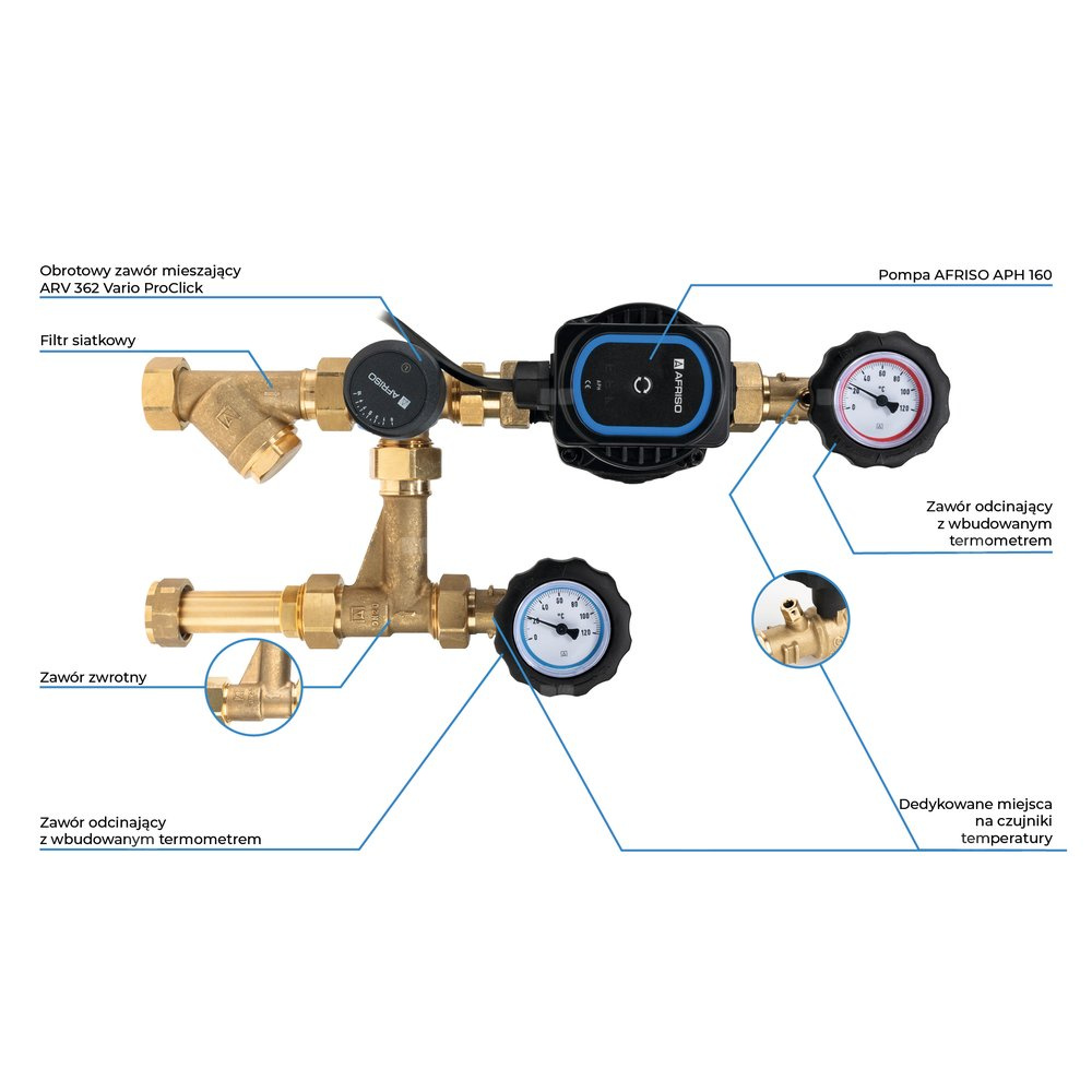 Zawory odcinające ze zintegrowanymi termometrami do kontroli temperatury medium na każdym przyłączu.