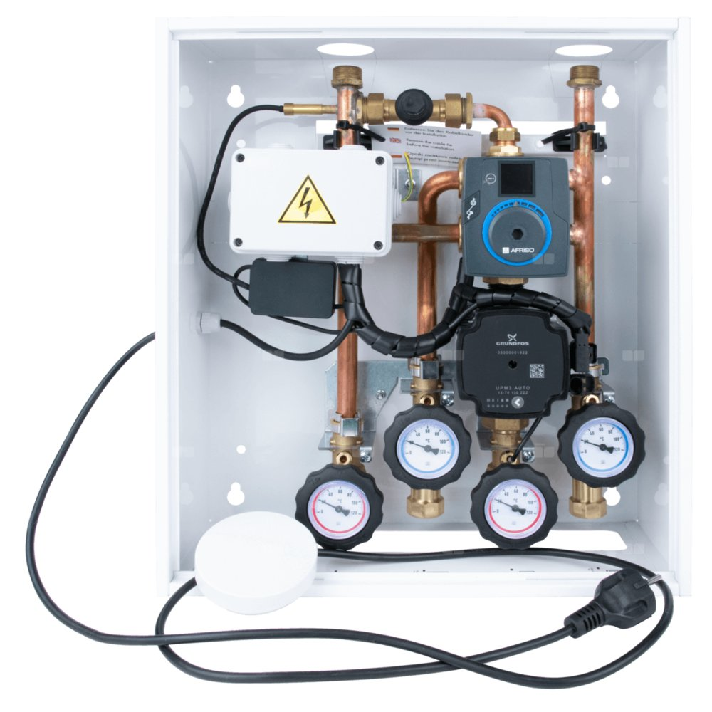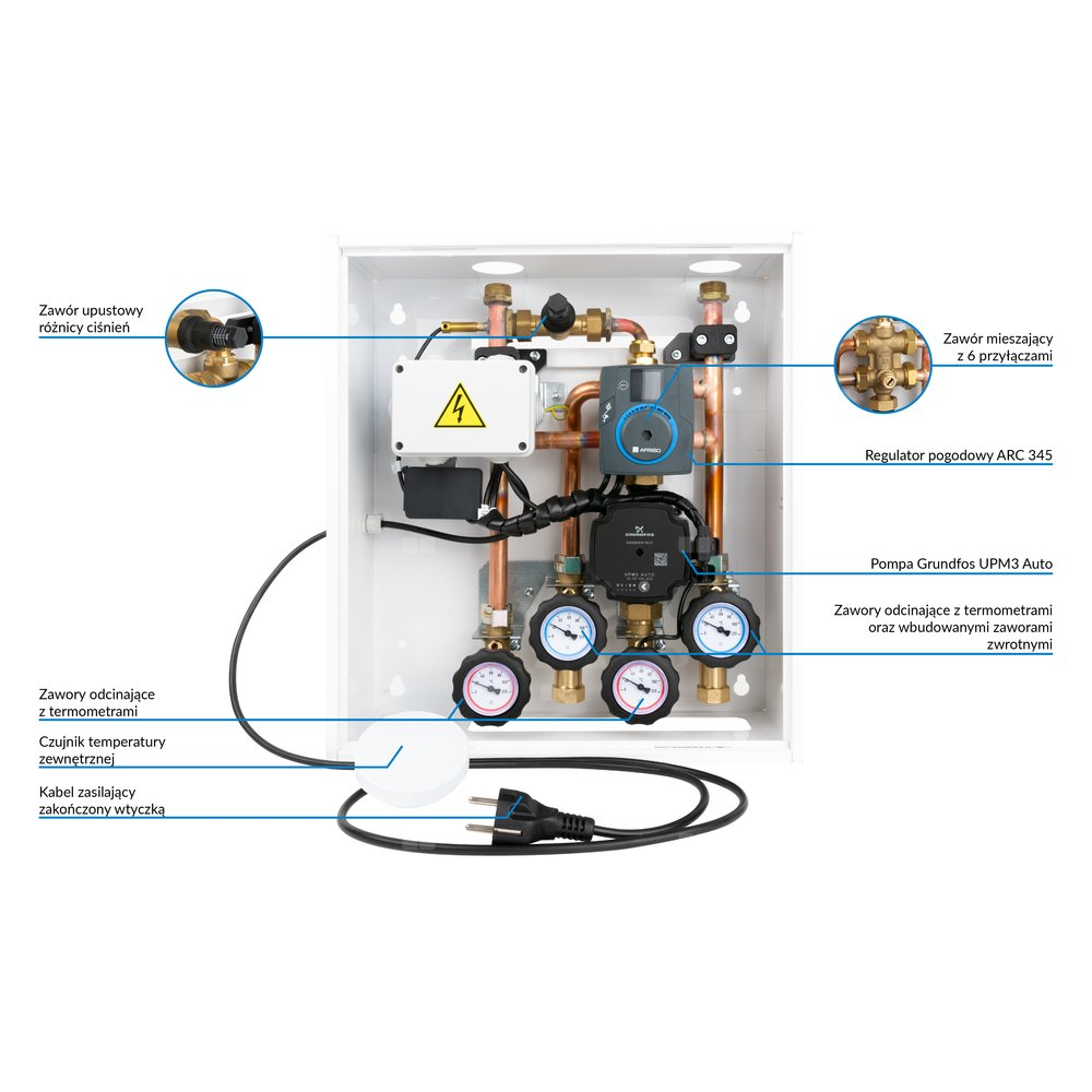Zawór mieszający oraz pompa obiegowa sterowane są regulatorem pogodowym ARC 345 ProClick, który reguluje temperaturę na podstawie temperatury zewnętrznej i ustawionej krzywej grzewczej.