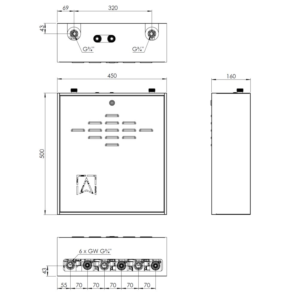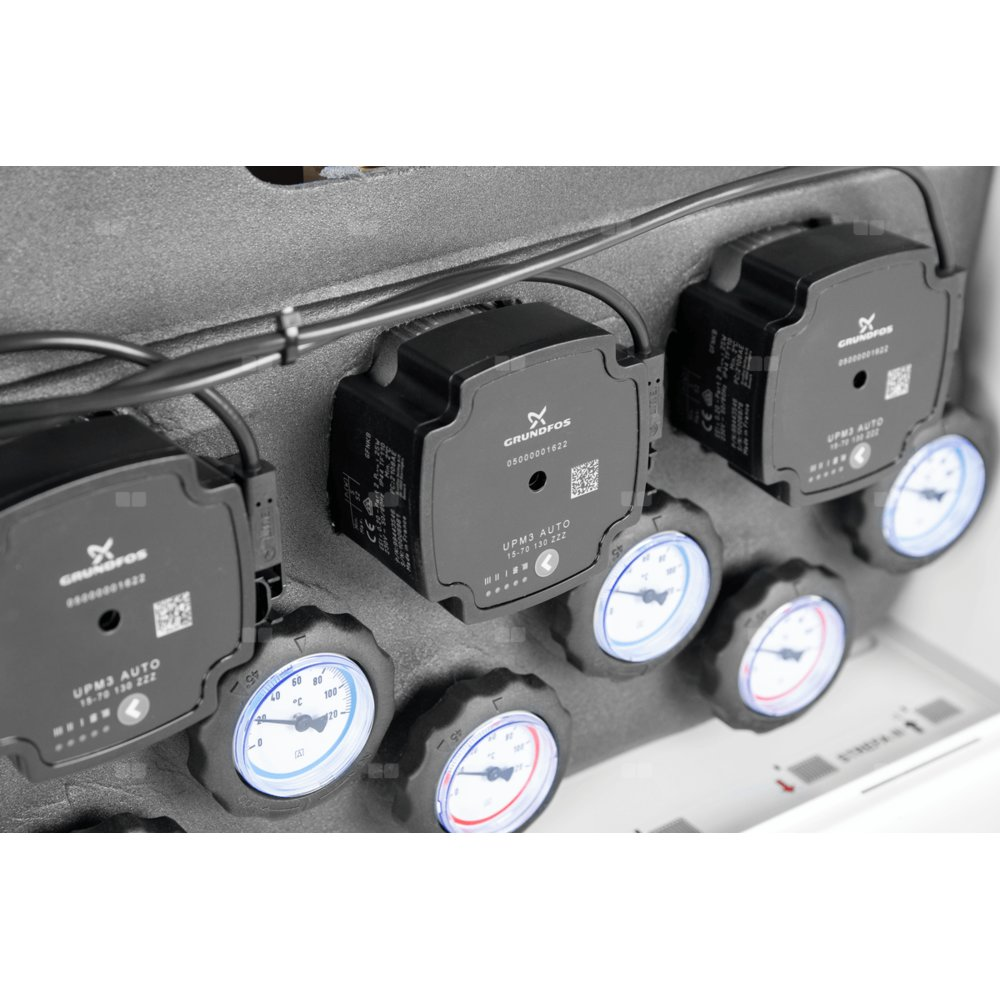 Wyposażony w pompy Grundfos UPm³ i termostatyczne zawory mieszające ATM 561 z regulacją 20 ÷ 43°C. Zakres dobrany na podstawie optymalnych temperatur zasilania instalacji ogrzewania podłogowego.