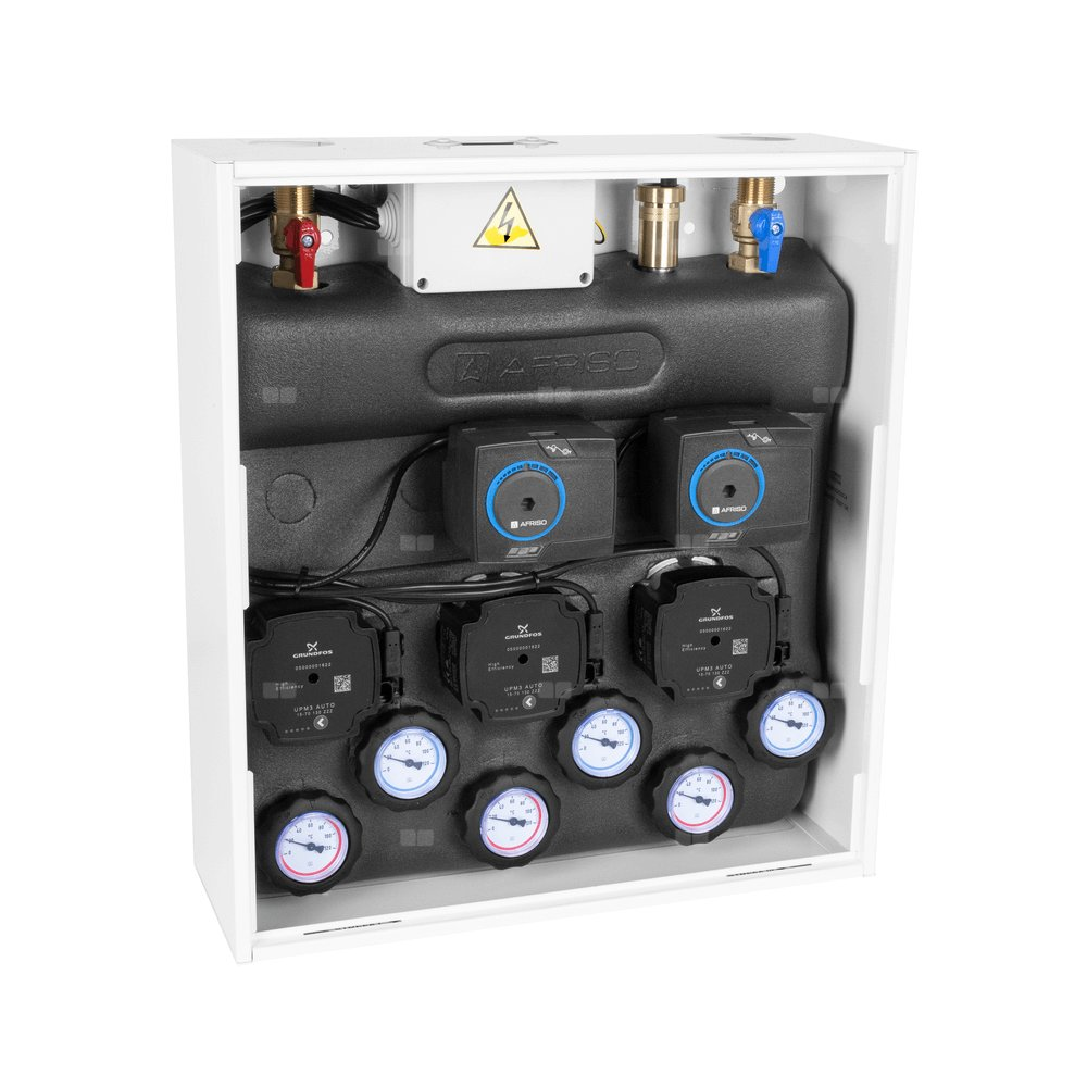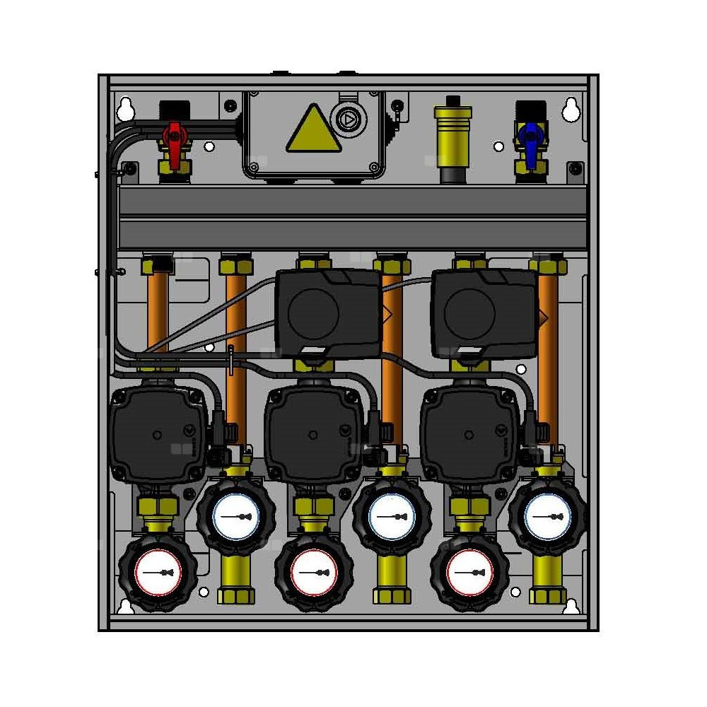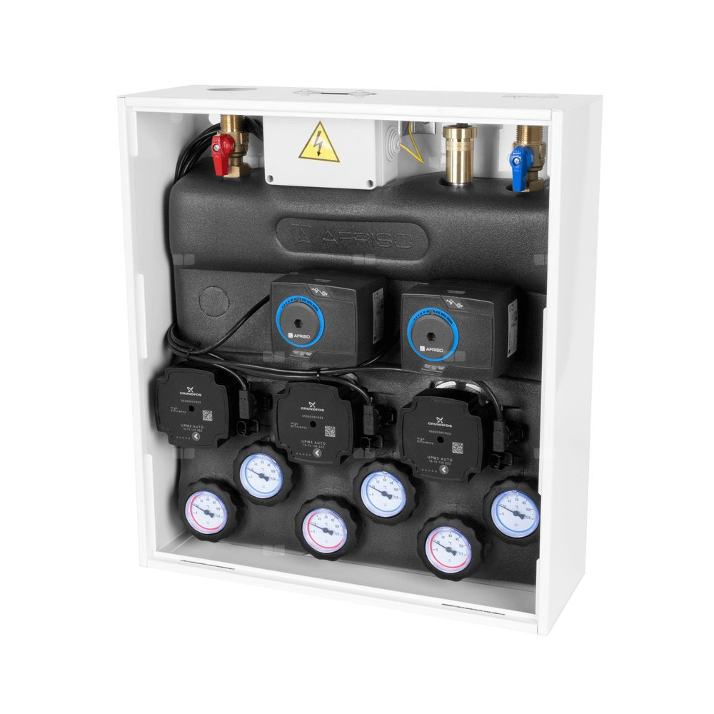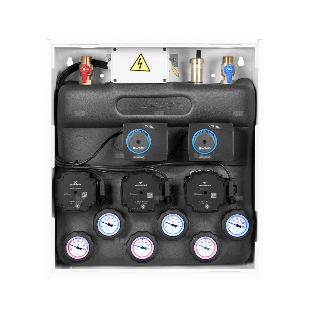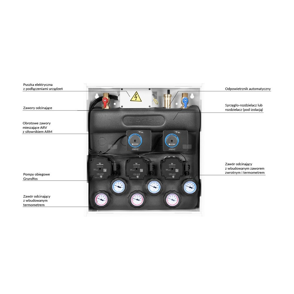 Wyposażony w pompy Grundfos UPm³ oraz zawory obrotowe z siłownikami ARM 141.