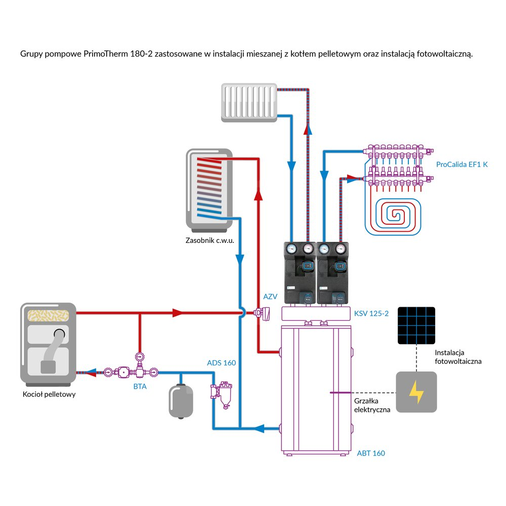 Zainstalowany zawór mieszający ARV KvsVario wartość Kvs ustawiana w zakresie 2,5÷12 m³/h, pompa AFRISO APH 25-7/180 oraz regulator ACT 343 ProClick (stałotemperaturowy, 230 V AC, 120 s).
