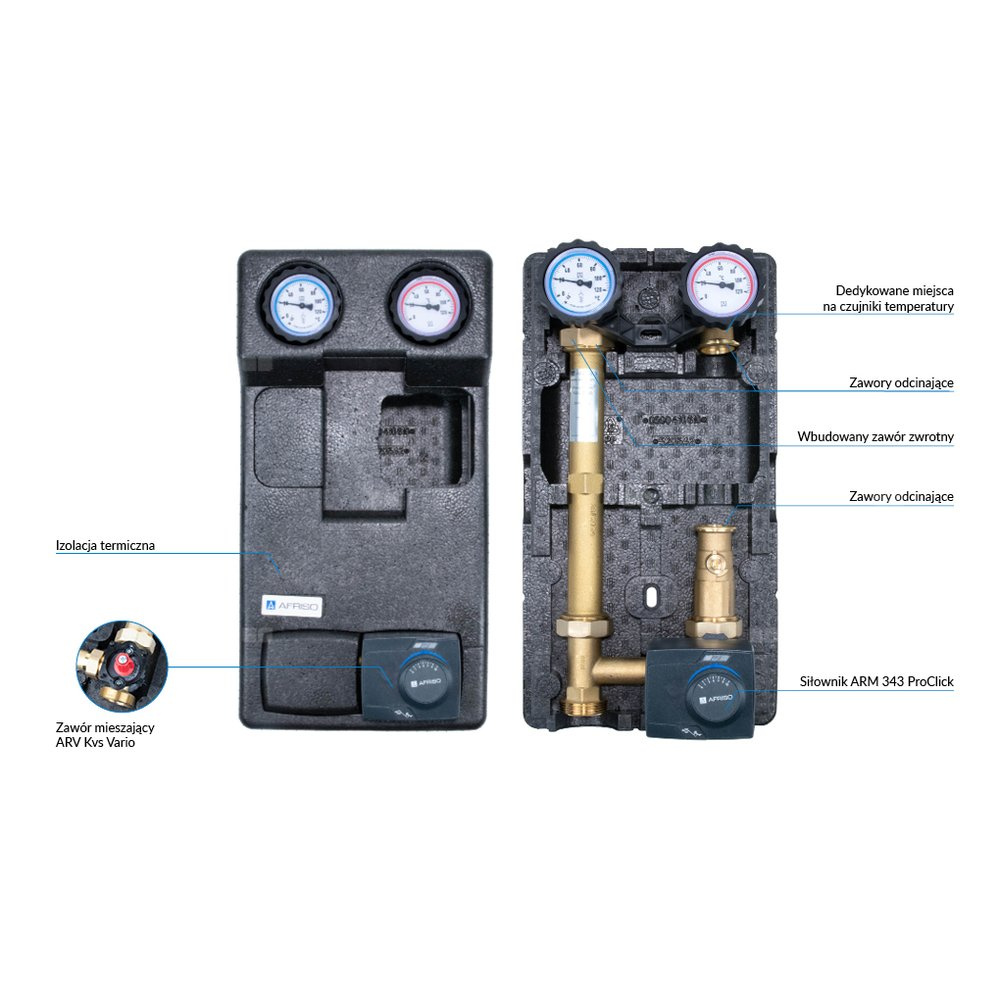 Grupa pompowa AFRISO PrimoTherm 180-2 DN 25 3-WM-SM Vario GZ x GW 1 1/2'' x 1'', z zaworem mieszającym, z izolacją, z siłownikiem arm 343 proclick