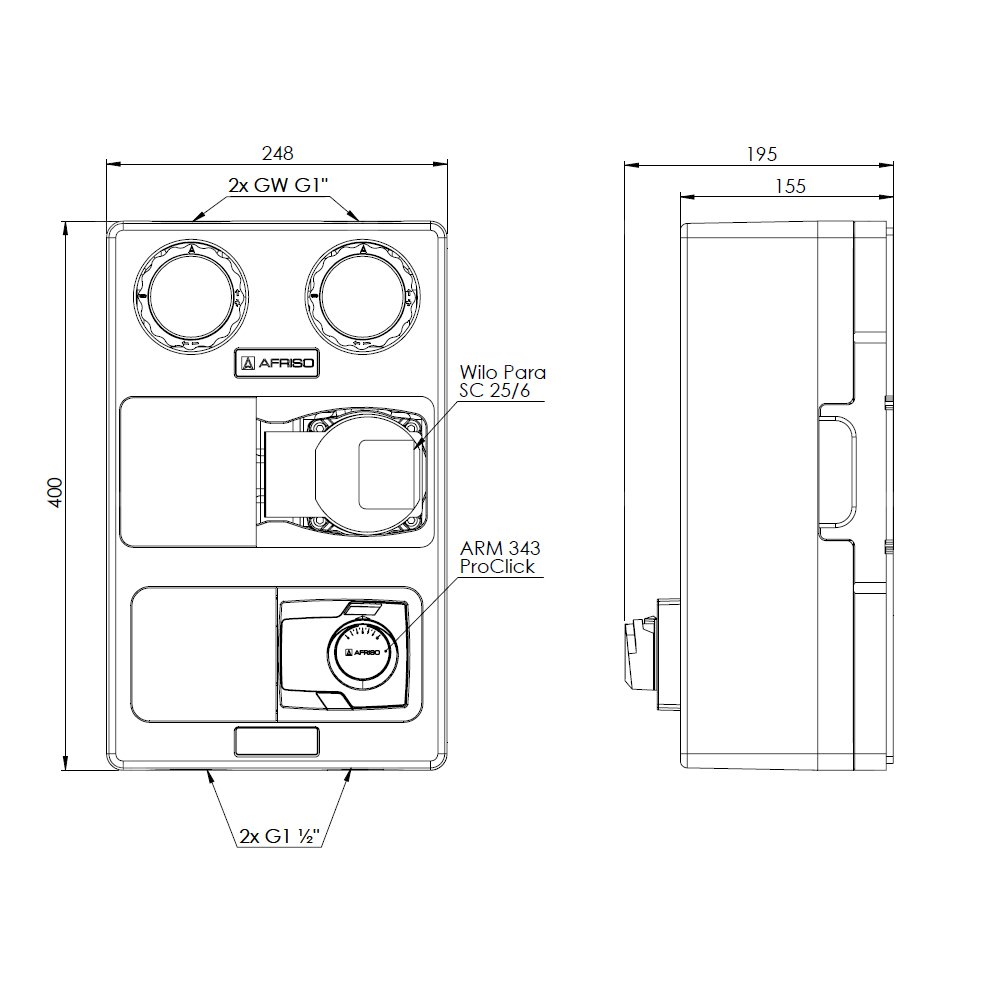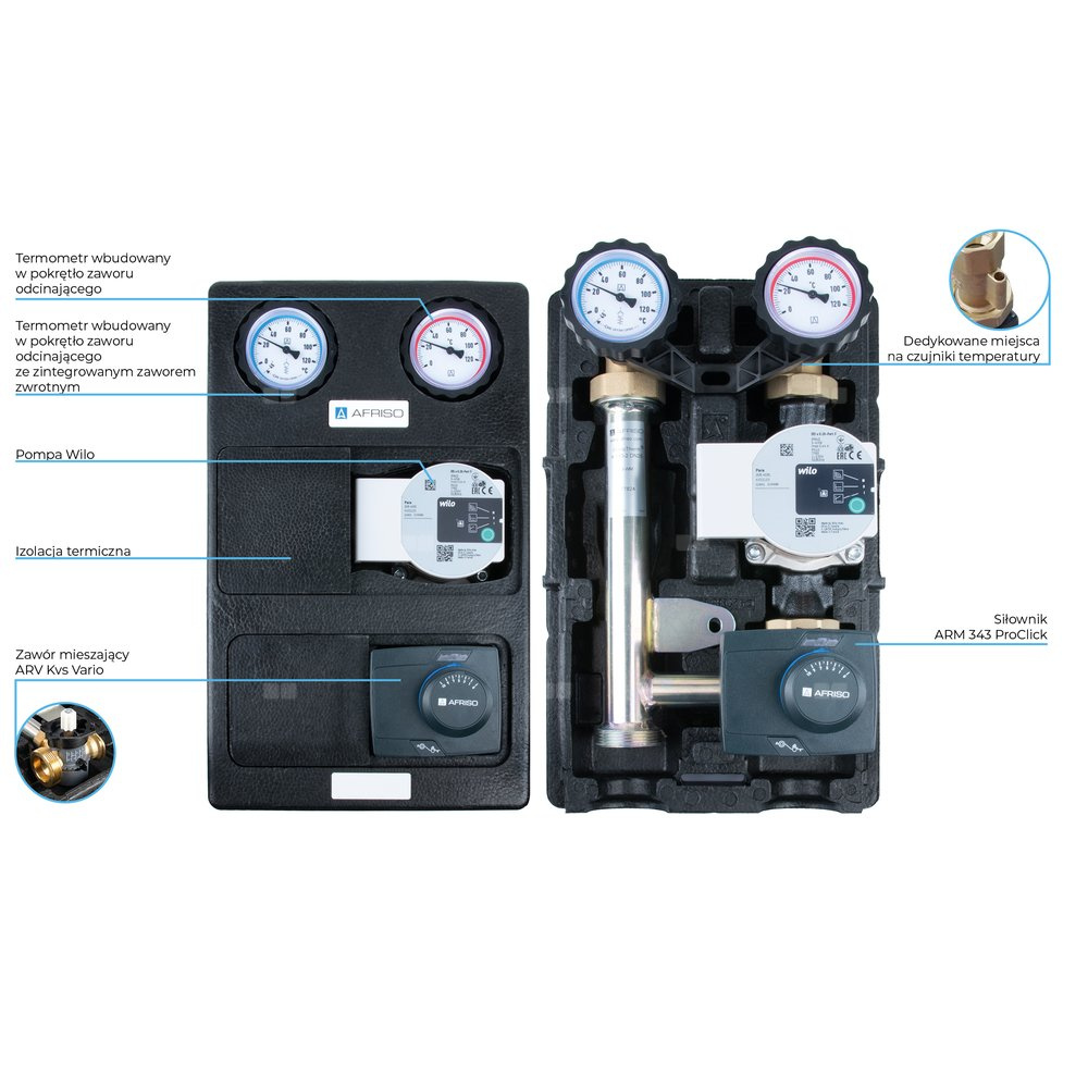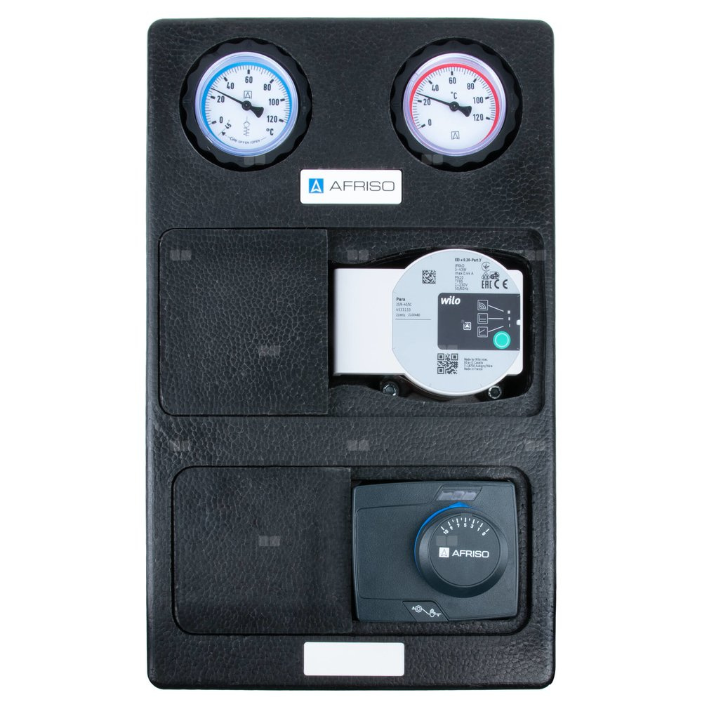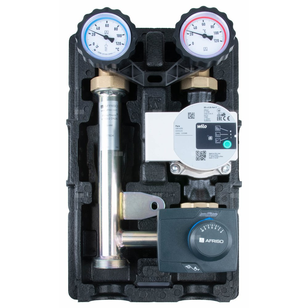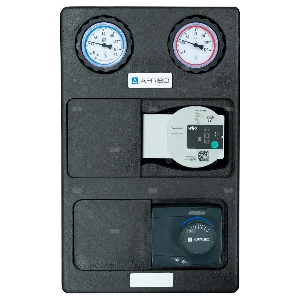 Grupa pompowa AFRISO PrimoTherm K 180-2 DN 25 WP 3-WM-SM GZ x GW 1 1/2'' x 1'', z zaworem mieszającym, z izolacją, z pompą obiegową Wilo Para SC 25/6, z siłownikiem arm 343 proclick