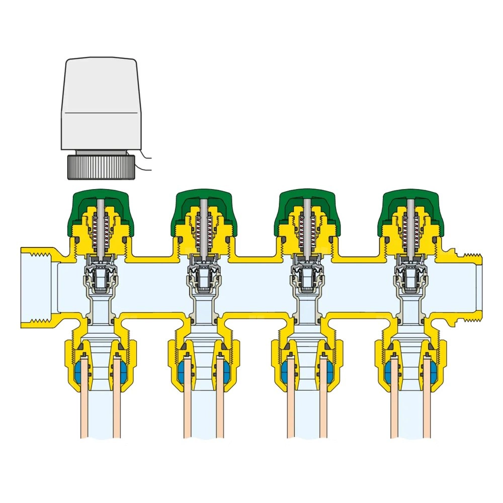 Zespół rozdzielaczy Zawiera: - rozdzielacz powrotny z wkładkami równoważącymi DYNAMICAL® przystosowanymi do współpracy z siłownikami elektrotermicznymi, zakres regulacji 25÷170 l/h; - rozdzielacz zasilania z przepływomierzami; - zakończenie rozdzielacza z automatycznym odpowietrznikiem z kapturkiem higroskopijnym i zaworem spustowym; - stalowe uchwyty montażowe do zastosowania w skrzynkach lub bezpośrednio na ścianie. główne podłączenie: G 1" (ISO 228-1) GW, Podłączenie do złączek Caleffi. przyłącza wylot: G 3/4" A (ISO 228-1) GZ, 11 wyjść. Maksymalne ciśnienie pracy: 6 bar. Zakres temperatury medium: 5–60 °C. Rozstaw wyjść: 50 mm. Zakres regulacji natężenia przepływu: 25–150 l/h.