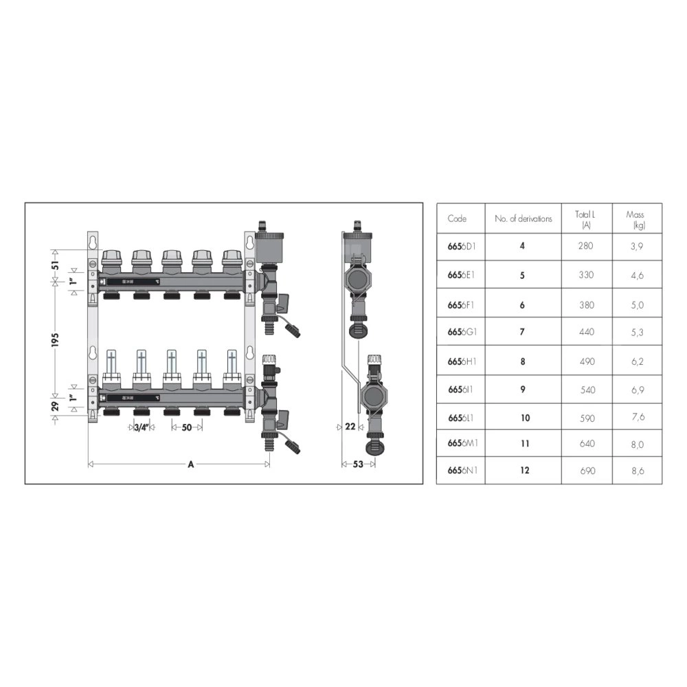 Zespół rozdzielaczy Zawiera: - rozdzielacz powrotny z wkładkami równoważącymi DYNAMICAL® przystosowanymi do współpracy z siłownikami elektrotermicznymi, zakres regulacji 25÷170 l/h; - rozdzielacz zasilania z przepływomierzami; - zakończenie rozdzielacza z automatycznym odpowietrznikiem z kapturkiem higroskopijnym i zaworem spustowym; - stalowe uchwyty montażowe do zastosowania w skrzynkach lub bezpośrednio na ścianie. główne podłączenie: G 1" (ISO 228-1) GW, Podłączenie do złączek Caleffi. przyłącza wylot: G 3/4" A (ISO 228-1) GZ, 6 wyjść. Maksymalne ciśnienie pracy: 6 bar. Zakres temperatury medium: 5–60 °C. Rozstaw wyjść: 50 mm. Zakres regulacji natężenia przepływu: 25–150 l/h.