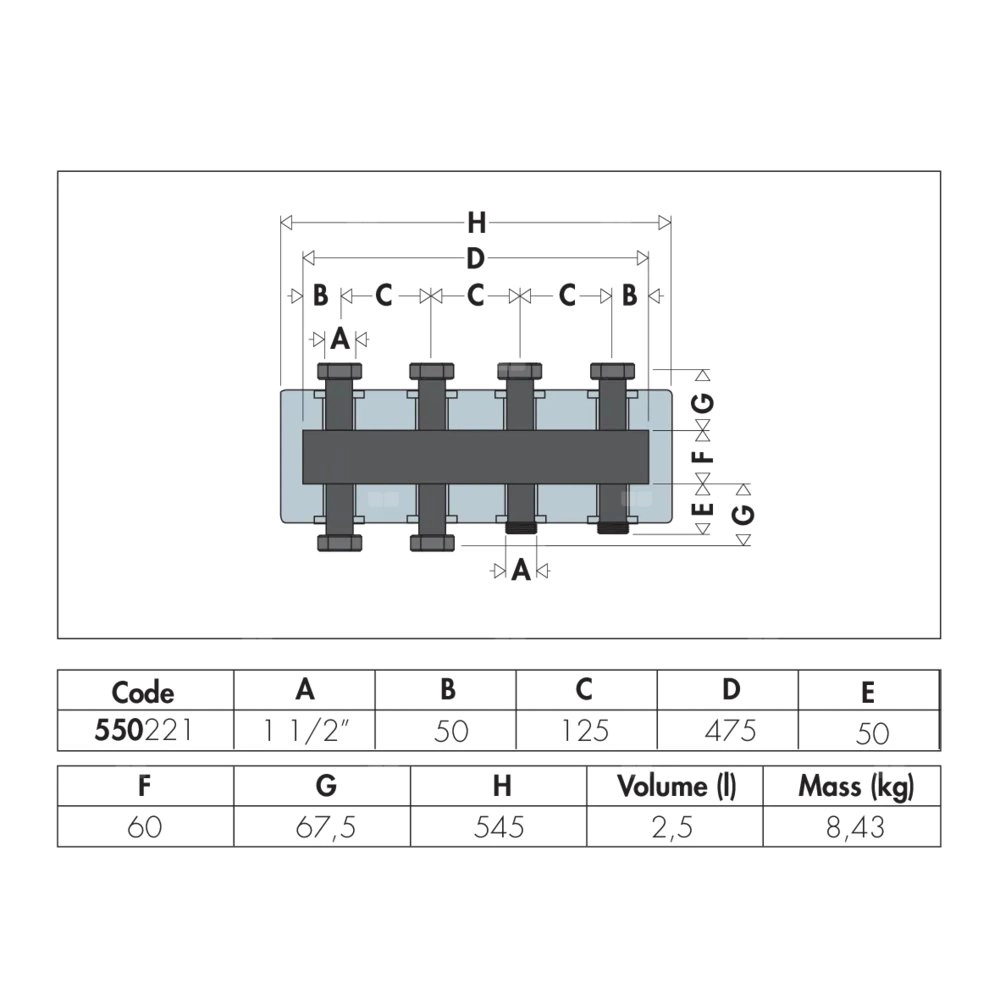 Rozdzielacz do instalacji grzewczych i chłodniczych. 2+1 wyjścia. Z izolacją. W komplecie ze wspornikami ze stali. główne podłączenie: G 1 1/2" A (ISO 228-1) GZ. przyłącza wylot: G 1 1/2" (ISO 228-1) GW, 1 wyjście, nakrętka mocująca. Maksymalne ciśnienie pracy: 6 bar. Zakres temperatury medium: 5–110 °C. Rozstaw przyłączy głównych: 125 mm. Materiał: stal.