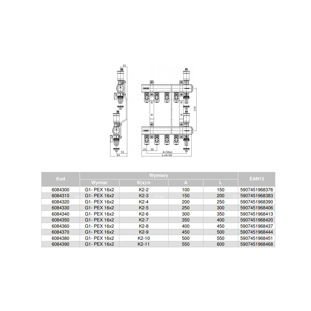 Rozdzielacz hydrauliczny VALVEX Proff K2 MINI-6 mosiądz (ocynk), odgałęzień: 6 (1/2''), do CO + zawory odcinające