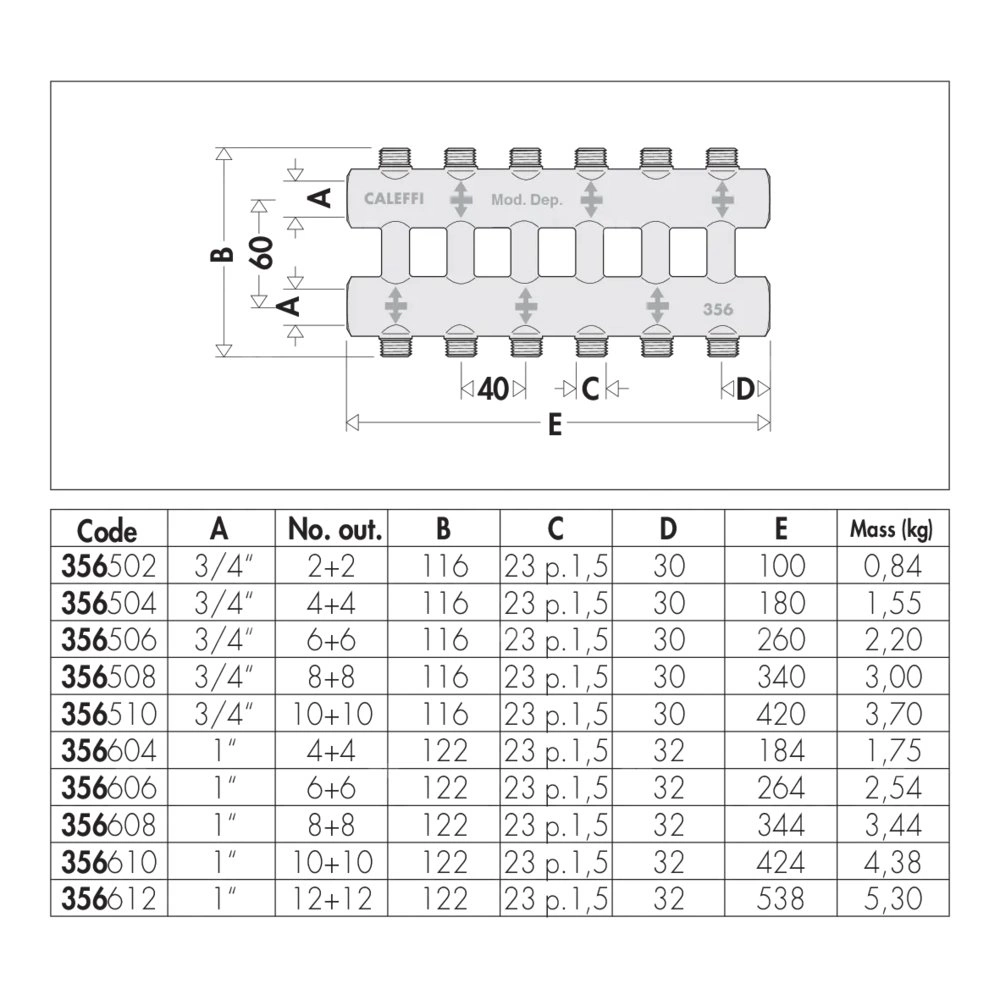 Rozdzielacz podwójny - monoblok Dla instalacji grzewczych i chłodniczych. Przyłącze: G 1" (ISO 228-1) GW, Podłączenie do złączek Caleffi. przyłącza wylot: 23 p.1,5, 6 wyjść. Maksymalne ciśnienie pracy: 10 bar. Zakres temperatury medium: 10–110 °C. Rozstaw przyłączy głównych: 60 mm. Rozstaw wyjść: 40 mm.