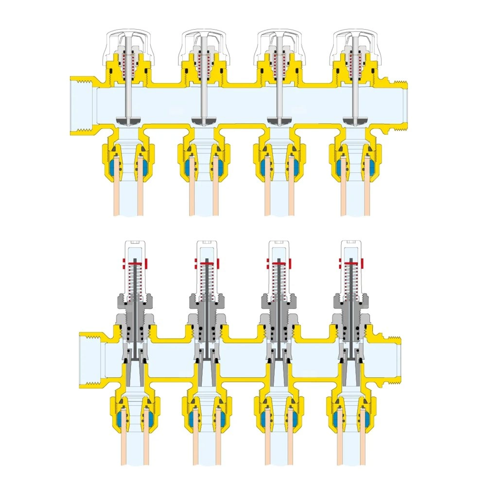 Zespół rozdzielaczy Zawiera: - rozdzielacz powrotny z wbudowanymi zaworami odcinającymi do siłownika termoelektrycznego; - rozdzielacz zasilający z przepływomierzami o skali 0-5 l/min i zaworami regulacyjnymi; - zakończenia rozdzielacza z automatycznym zaworem odpowietrzającym i zaworem spustowym; - uchwyty montażowe z technopolimeru z regulowaną odległością od środka do użycia ze skrzynkami serii 659 lub do bezpośredniego mocowania na ścianie. główne podłączenie: G 1" (ISO 228-1) GW, Podłączenie do złączek Caleffi. przyłącza wylot: G 3/4" A (ISO 228-1) GZ, 9 wyjść. Maksymalne ciśnienie pracy: 6 bar. Zakres temperatury medium: 5–60 °C. Rozstaw wyjść: 50 mm. Zakres regulacji natężenia przepływu: 0–5 l/min.