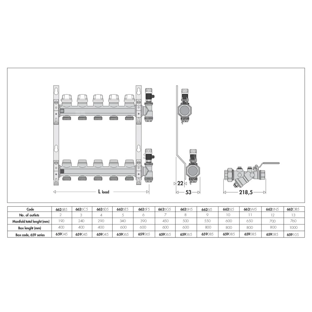 Zespół rozdzielaczy. Zawiera: -rozdzielacz powrotny z zaworami odcinającymi z możliwością przyłączenia siłownika termoelektrycznego; - rozdzielacz zasilający z zaworami do wstępnej regulacji natężenia przepływu; - zakończenia rozdzielacza z ręcznymi zaworami odpowietrzającymi i korkami; - uchwyty montażowe z polimeru z możliwością regulacji rozstawu do użycia ze skrzynką serii 659 lub 661 lub do montażu bezpośrednio na ścianie. Przyłącze: G 1" (ISO 228-1) GW, Podłączenie do złączek Caleffi. przyłącza wylot: G 3/4" A (ISO 228-1) GZ, 2 wyjścia. Maksymalne ciśnienie pracy: 10 bar. Zakres temperatury medium: 5–100 °C. Rozstaw wyjść: 50 mm.