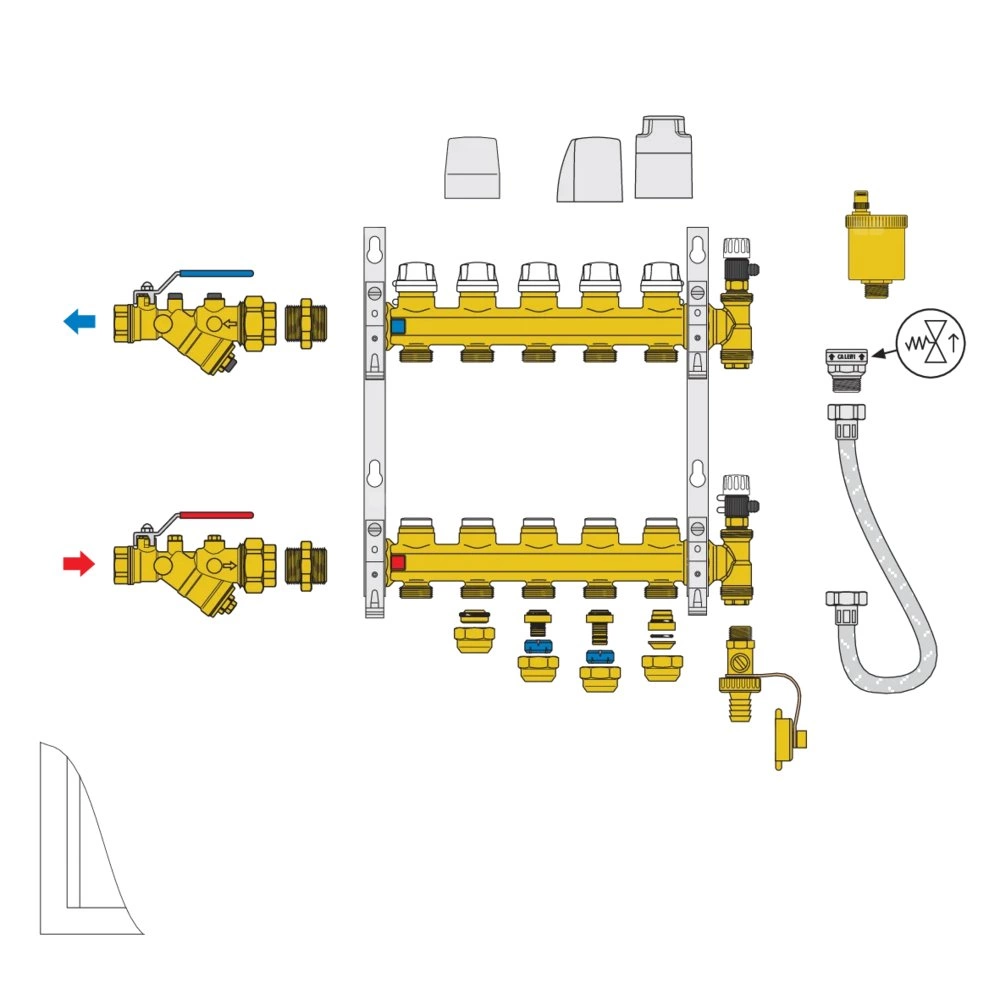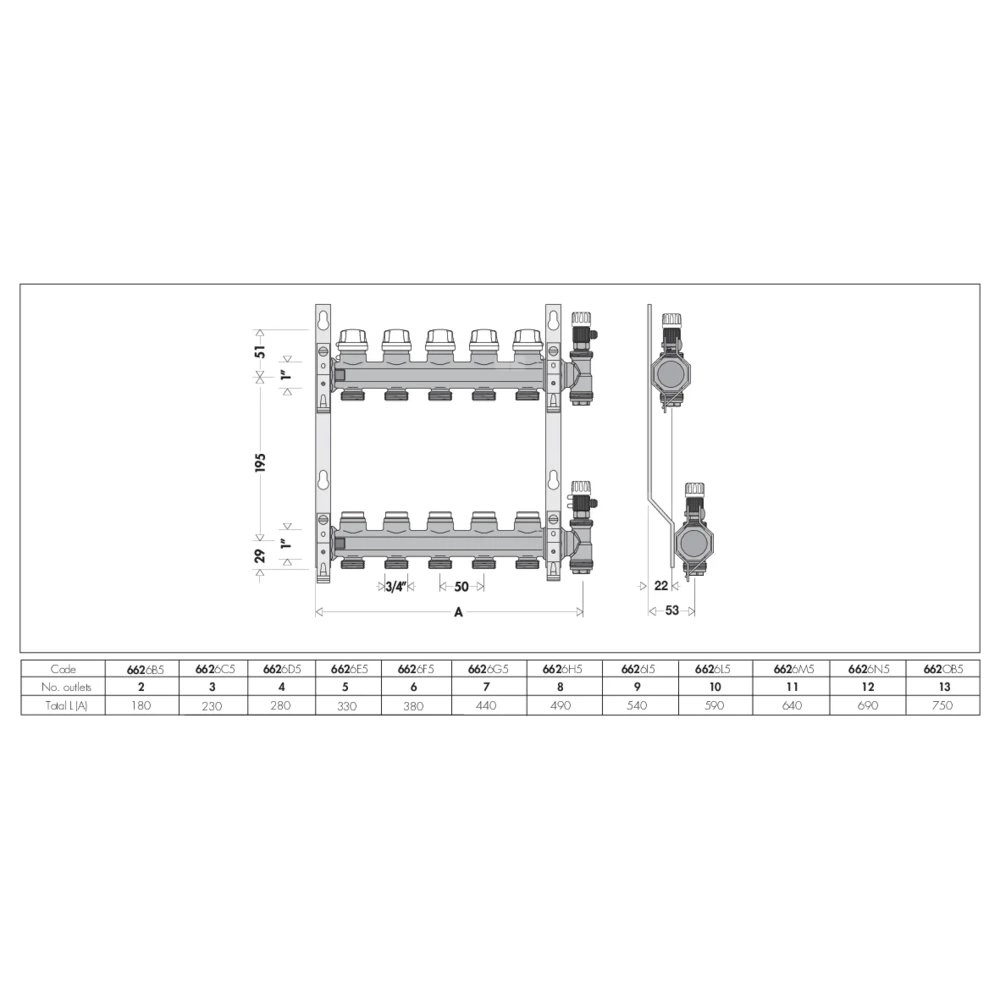 Zespół rozdzielaczy. Zawiera: -rozdzielacz powrotny z zaworami odcinającymi z możliwością przyłączenia siłownika termoelektrycznego; - rozdzielacz zasilający z zaworami do wstępnej regulacji natężenia przepływu; - zakończenia rozdzielacza z ręcznymi zaworami odpowietrzającymi i korkami; - uchwyty montażowe z polimeru z możliwością regulacji rozstawu do użycia ze skrzynką serii 659 lub 661 lub do montażu bezpośrednio na ścianie. Przyłącze: G 1" (ISO 228-1) GW, Podłączenie do złączek Caleffi. przyłącza wylot: G 3/4" A (ISO 228-1) GZ, 6 wyjść. Maksymalne ciśnienie pracy: 10 bar. Zakres temperatury medium: 5–100 °C. Rozstaw wyjść: 50 mm.
