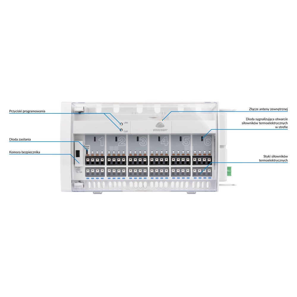 Steruje temperaturą w pomieszczeniach / strefach przez siłowniki termoelektryczne na podstawie sygnałów z termostatów tam umieszczonych.