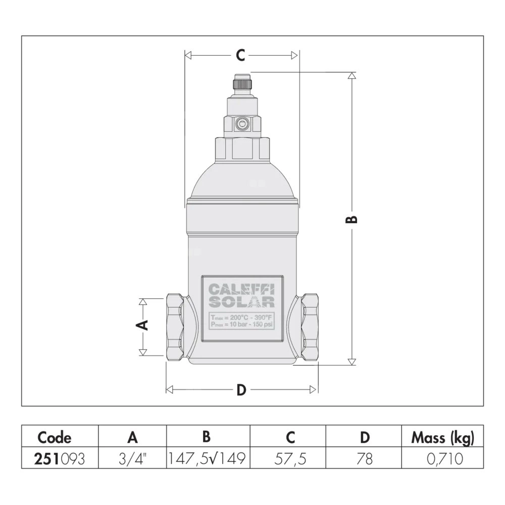 Ręczny separator powietrza do instalacji solarnych Przyłącze: G 3/4" (ISO 228-1) GW. Maksymalne ciśnienie pracy: 10 bar. Zakres temperatury medium: -30–200 °C. Maksymalne stężenie glikolu: 50 %. Medium: woda, Roztwory glikolu. Materiał: mosiądz.