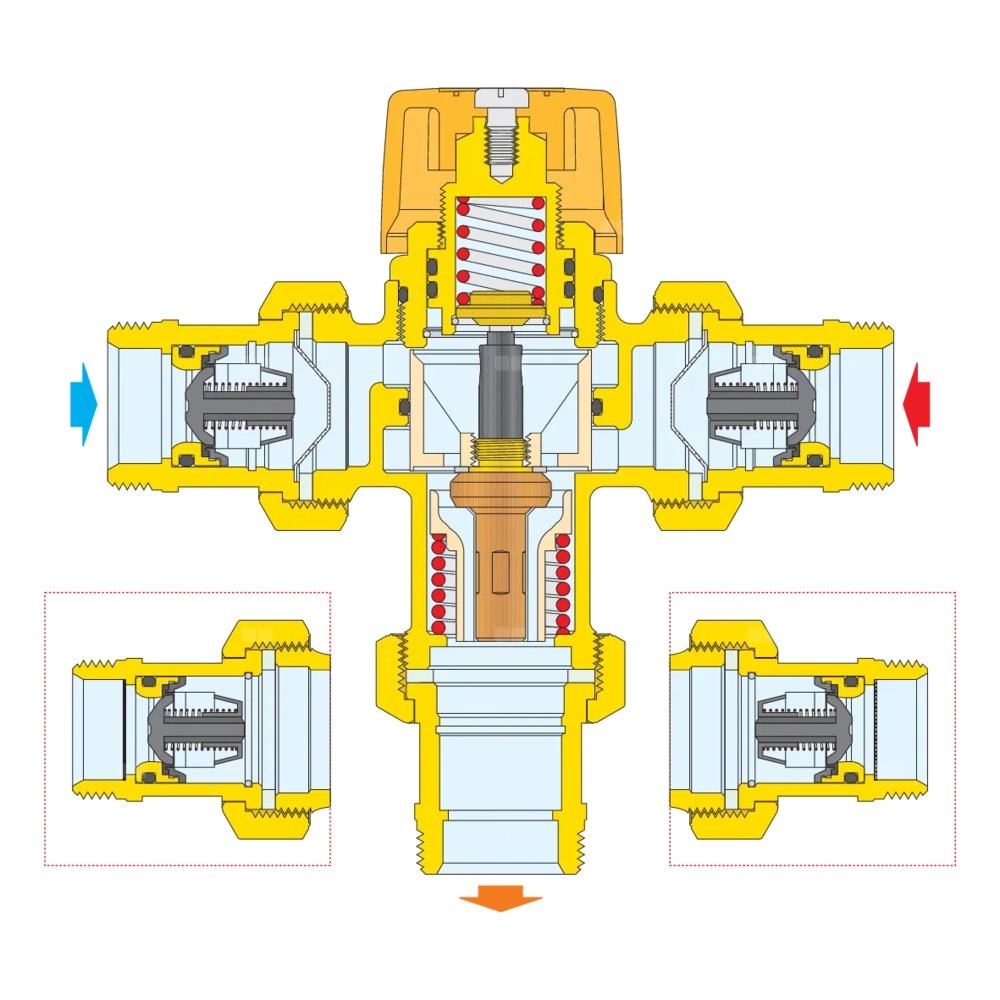 Regulowany termostatyczny antyoparzeniowy zawór mieszający z zaworami zwrotnymi i filtrami do instalacji solarnych. Z funkcją oc