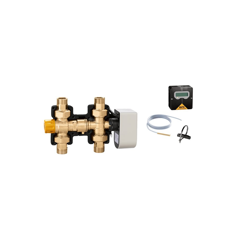 Zestaw połączeniowy zasobnika z kotłem z rozdzielonymi termicznie obiegami Z mikroprzełącznikiem pomocniczym Zawiera: -termostatyczny antyoparzeniowy zawór mieszający regulowany przy użyciu pokrętła; -filtry i zawory zwrotne na wlotach; -zawór rozdzielający z siłownikiem trzypunktowym z mikroprzełącznikiem pomocniczym; -termostat z czujnikiem do instalacji solarnych dla zaworu rozdzielającego; -wyświetlacz temperatury; -obudowę zabezpieczającą; -połączenie zaworu rozdzielającego z zaworem mieszającym z regulowaną pozycją złącz wlotowych i wylotowych. Przyłącze: G 3/4" A (ISO 228-1) GZ. Maksymalne ciśnienie pracy: 10 bar. Zakres temperatury medium: -5–110 °C. Zakres regulacji temperatury: 35–55 °C. Zasilanie elektryczne: 230 V (AC). Materiał: stop mosiądzu odporny na odcynkowanie z niską zawartością ołowiu.