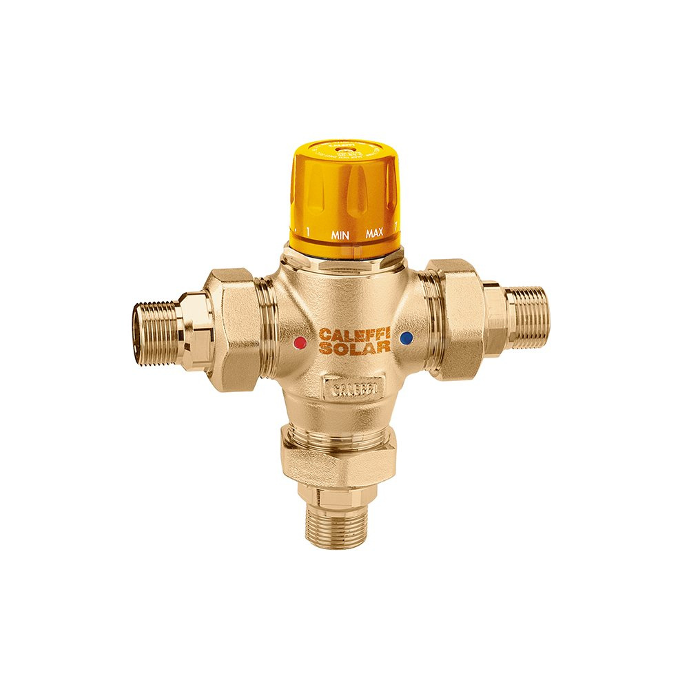 Termostatyczny zawór mieszający, z wymiennym wkładem, do instalacji solarnych Przyłącze: G 2" A (ISO 228-1) GZ, złączka. Maksymalne ciśnienie pracy: 14 bar. Zakres temperatury medium: 0–110 °C. Zakres regulacji temperatury: 35–65 °C. Kv: 19,0 m³/h. Materiał: mosiądz.