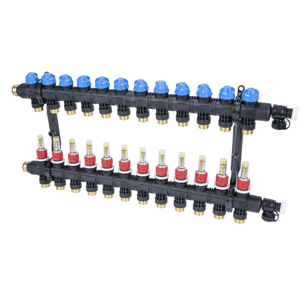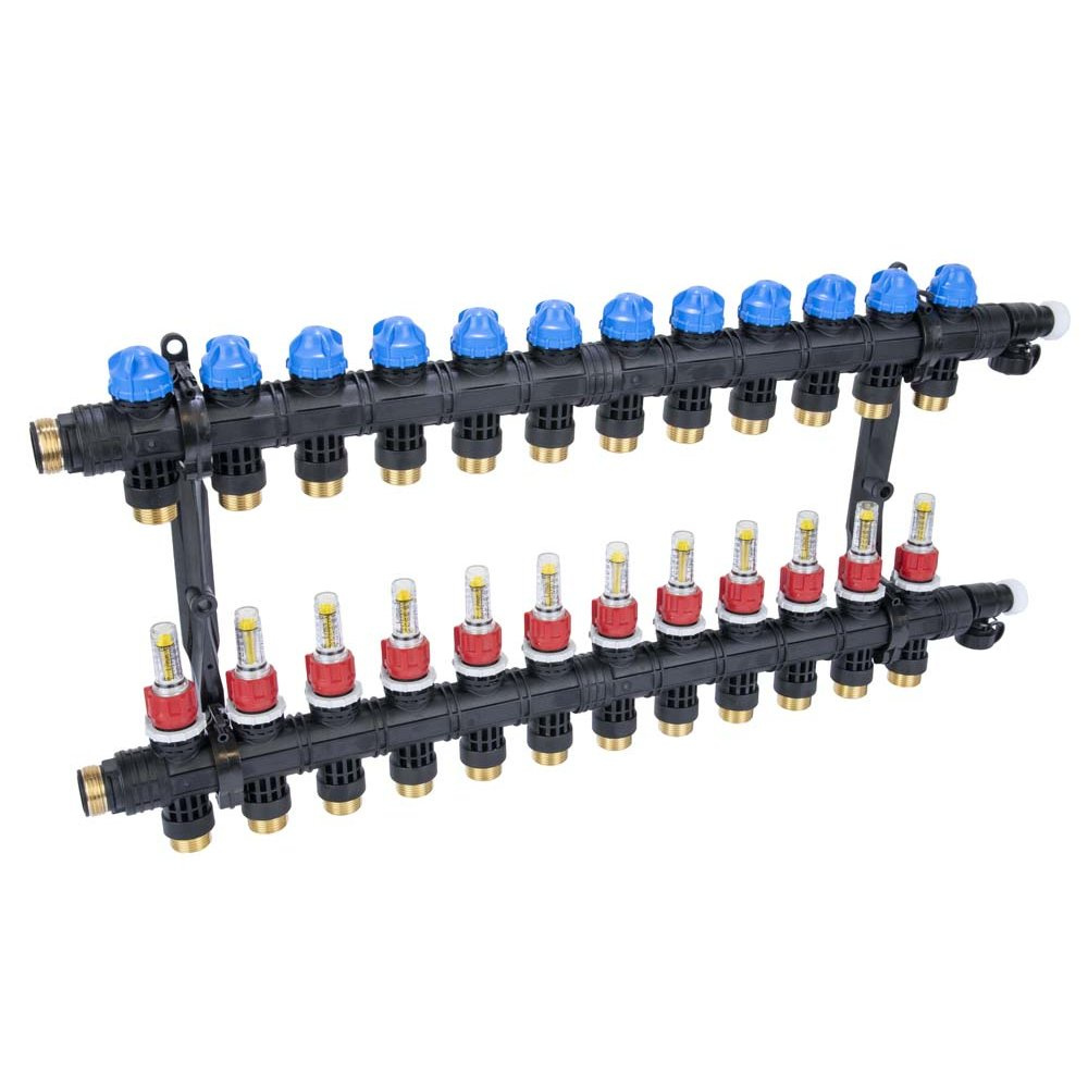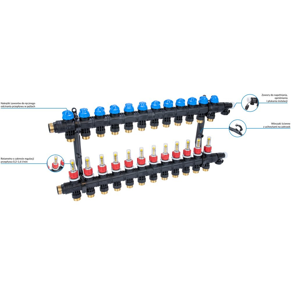 Rozdzielacz do ogrzewania podłogowego AFRISO ProCalida EF1 K 12-obieg. poliamid GZ 1" x Eurocono 3/4" + przepływomierz + zawór napełn/spust