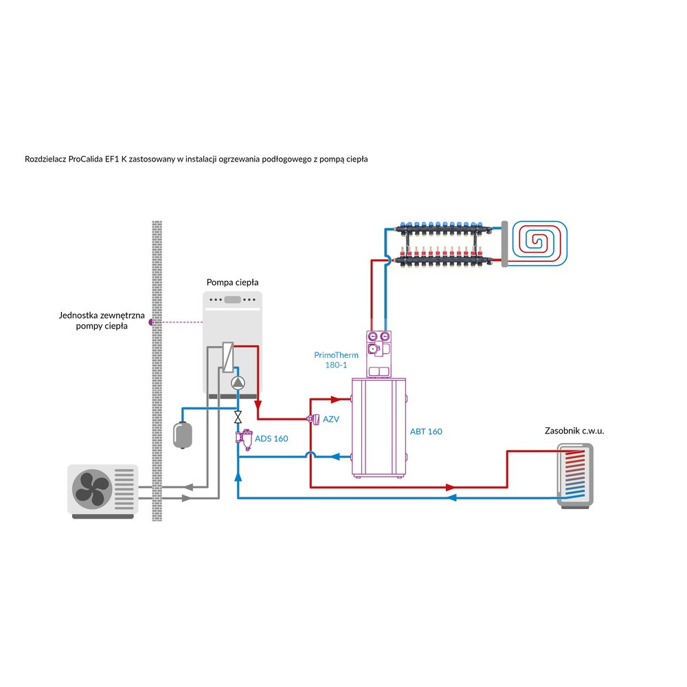 Rozdzielacze poliamidowe ProCalida EF1 K stosuje się w instalacjach ogrzewania lub chłodzenia płaszczyznowego. Montowane są głównie w szafkach umieszczonych w ścianach budynku, skąd rozprowadzają ciepło ze źródła do poszczególnych pętli instalacji płaszczyznowej. Możliwy jest również montaż pod stropem w instalacjach sufitowych. Z ich pomocą reguluje się ilość ciepła kierowaną do konkretnych pomieszczeń, napełnia, opróżnia oraz odpowietrza instalacje płaszczyznowe. Połączone z systemami sterowania FloorControl lub CosiTherm i siłownikami termoelektrycznymi TSA zapewniają stale komfortową temperaturę w każdym z pomieszczeń.