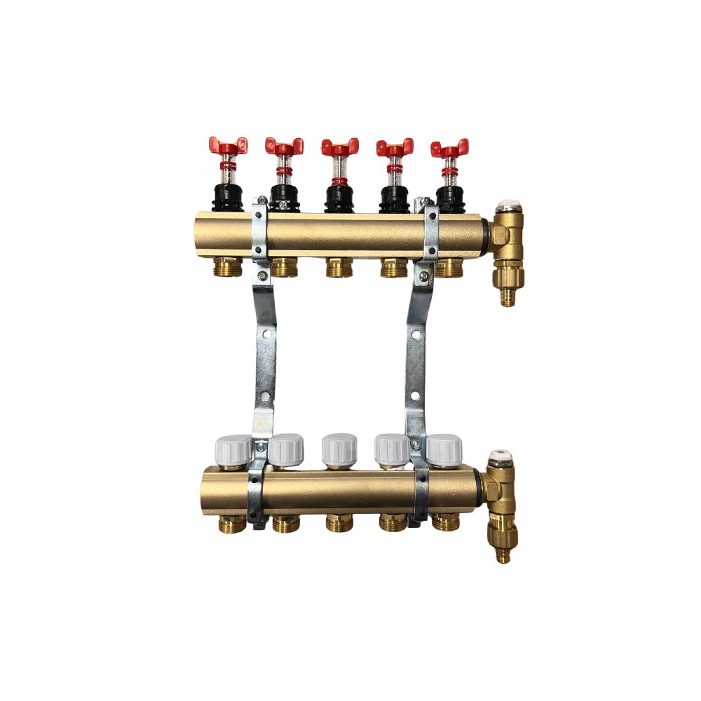Rozdzielacz ogrzewania podłogowego, przeznaczony do rozdzielenia medium grzewczego na poszczególne pętle. Belki mosiężne profilowe 1" o wysokości profilu 39mm. Wyposażenie: przepływomierze z tworzywa do 2,6L/min z nyplami na belce zasilającej, zawory termostatyczne M30x1,5 z nyplami na belce powrotnej, trójniki odpowietrzająco spustowe, zawory spustowe.