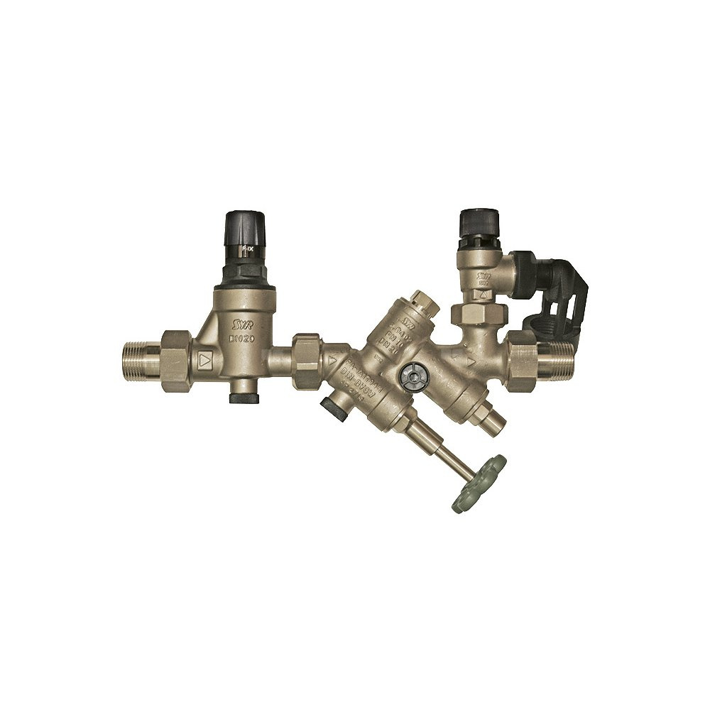 Zespół przeznaczony jest do zabezpieczania zamkniętych podgrzewaczy i zasobników wody pitnej. Na wejściu reduktor ciśnienia 1,5 - 6,0 bar (nastawa fabryczna 4 bar). SYROBLOC 25 DN20 składa się z zaworu odcinającego, zaworu zwrotnego z możliwością jego kontroli, drugiego zaworu odcinającego i zaworu bezpieczeństwa 2115N z koszem wyrzutowym. Korpus z mosiądzu, pokrywa z tworzywa odpornego na wysoką temperaturę, utwardzonego włóknem szklanym. Atest PZH. Przyłącza G3/4", ciśnienie otwarcia zaworu bezpieczeństwa 10 bar.