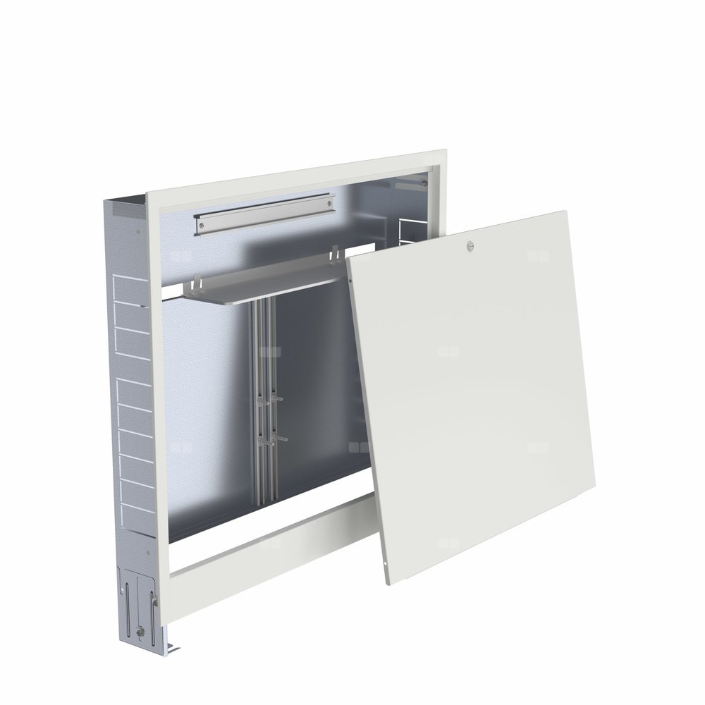 Szafki podtynkowe do rozdzielaczy ogrzewania podłogowego i grzejnikowego. Zastosowana ochrona antykorozyjna: płukanie chemiczne (odtłuszczanie), powłoka cyrkonowa, malowanie proszkowe farbą epoksydowo-poliestrową. Korpus szafki cynkowany wykonany z jednego arkusza blachy - łączony bez spawania. Ramka i drzwi szafki w całości malowane proszkowo. Łatwy, czysty montaż rozdzielacza. Ułatwiony szeroki dostęp do rozdzielacza podczas montażu. Mniejsze prawdopodobieństwo uszkodzenia ramki i drzwi szafki. Zamek na monetę. Szyny montażowe cynkowane z kompletem śrub i nakrętek ułatwiających montaż rozdzielacza.