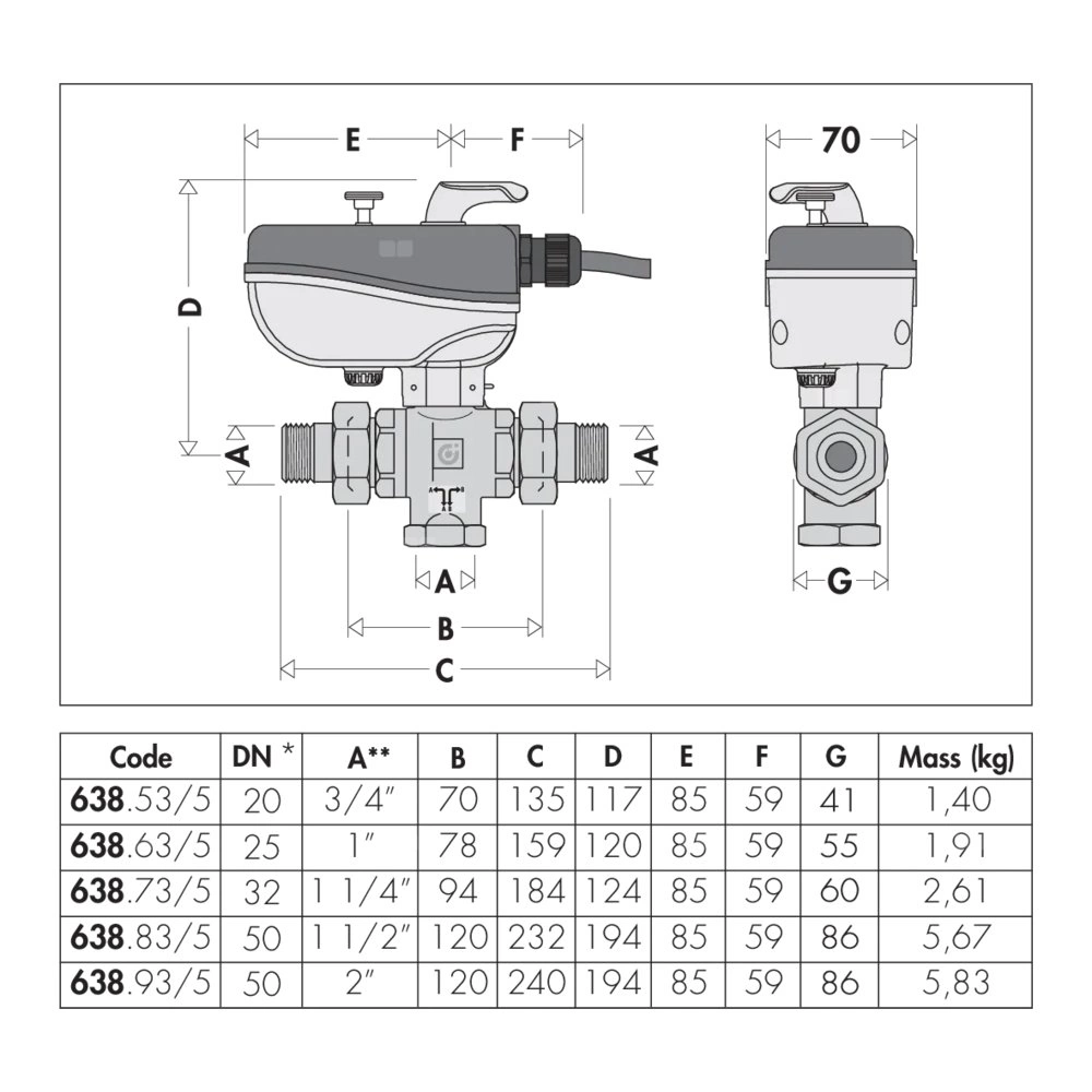 Trójdrożny zawór kulowy z siłownikiem. Z izolacją dla instalacji grzewczych i chłodniczych 1 1/4", czas zadziałania 50s