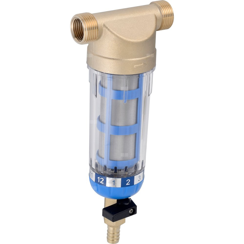 Prefiltr WF PRE1-1/2 z opłukiwaniem siatki filtracyjnej wykonanej ze stali nierdzewnej, korpus z gwintem wewnętrznym i zewnętrznym 1", w zestawie komplet redukcji na ½"