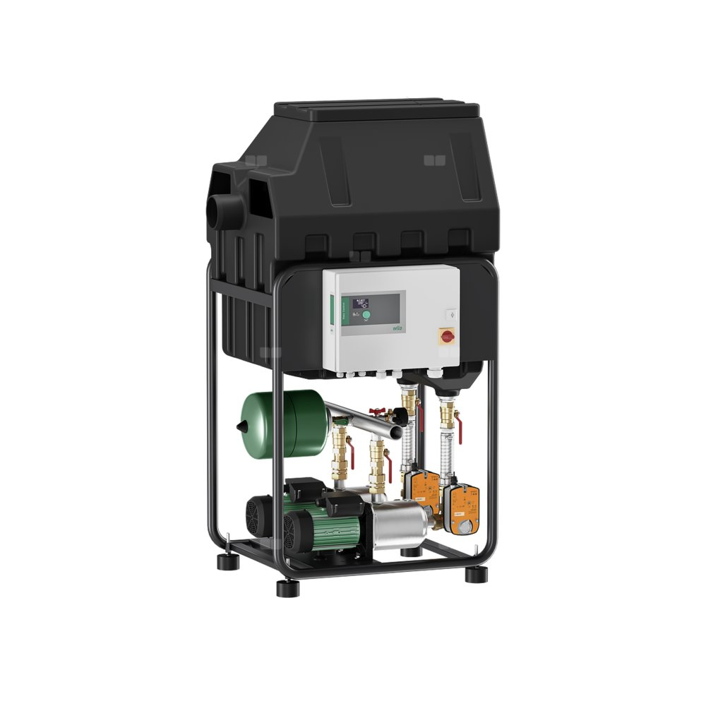 Kompaktowe urządzenie do wykorzystania wody deszczowej zgodnie z DIN 1989-100 oraz DIN EN 16941-1 z elastycznym orurowaniem zbiorczym po stronie tłocznej i dwoma oddzielnymi przyłączami przewodów ssawnych w celu oszczędzania wody użytkowej. Składa się z dwóch cichych, samozasysających, wielostopniowych, poziomych wysokociśnieniowych pomp wirowych typoszeregu Wilo-Medana CH1-LSP. Gotowe do podłączenia, zamontowane na ramie z rur stalowych z nóżkami o regulowanej wysokości, wraz z urządzeniem regulacyjnym do wygodnego sterowania systemem.
