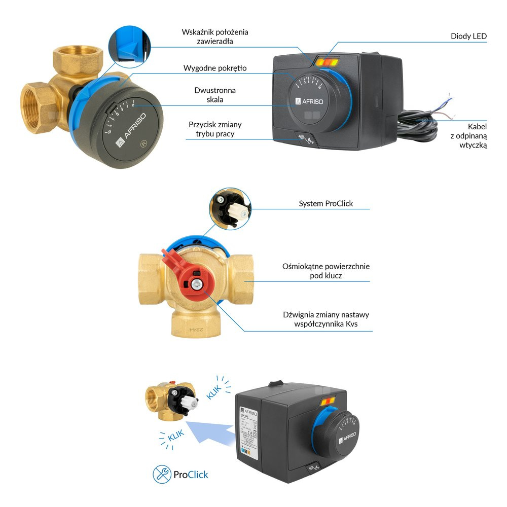 Urządzenia wyposażone w system ProClick – pozwala na bezpośredni montaż siłownika na zaworze bez użycia dodatkowych narzędzi.