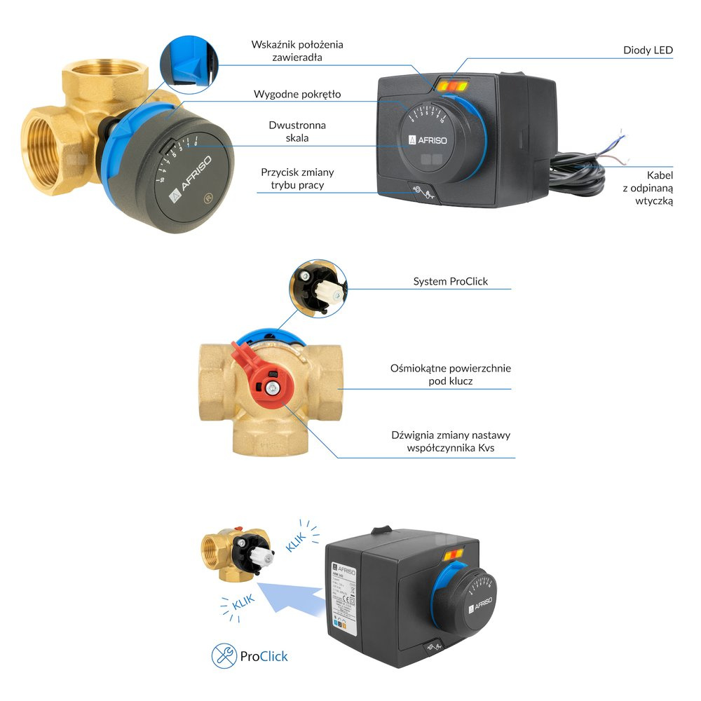 Urządzenia wyposażone w system ProClick – pozwala na bezpośredni montaż siłownika na zaworze bez użycia dodatkowych narzędzi.