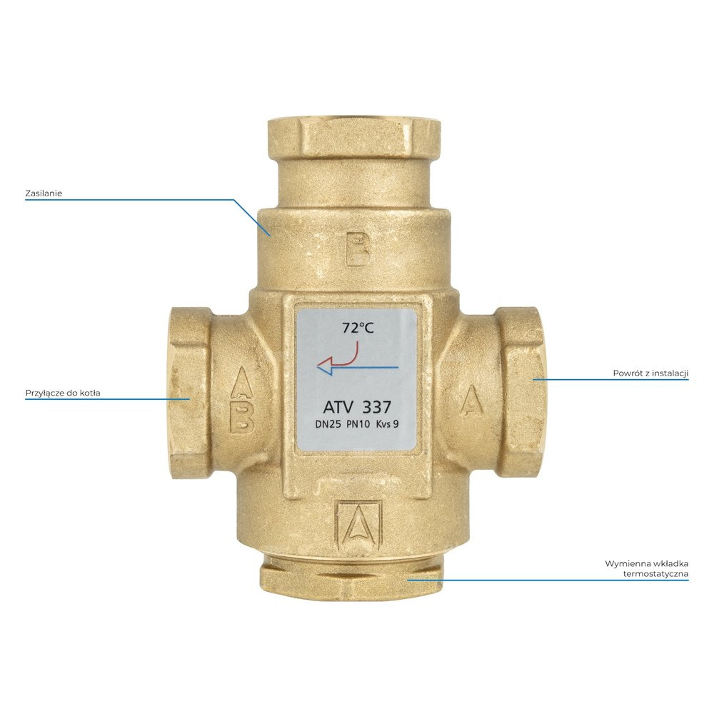 Stosowany w instalacjach grzewczych z kotłami stałopalnymi, zalecany szczególnie do instalacji z buforami ciepła.Montowany na powrocie z instalacji.