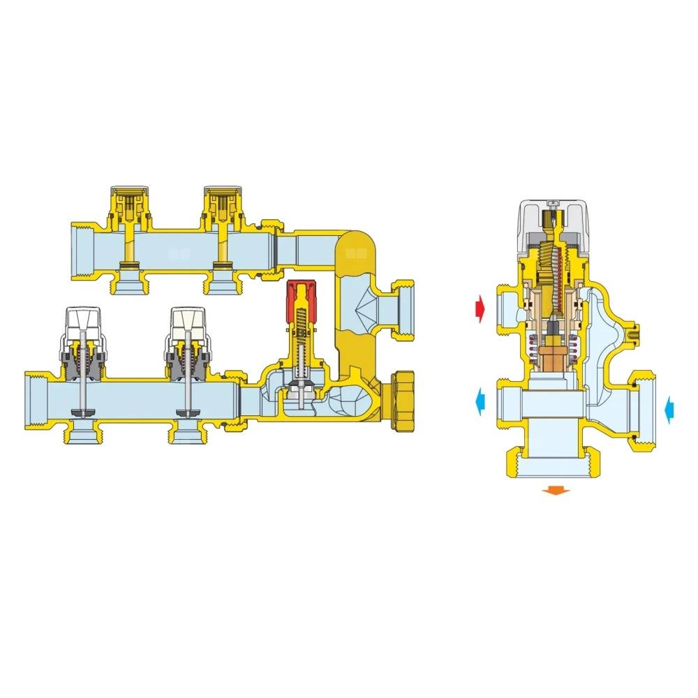 Zespół regulacyjny - regulacja stałotemperaturowa. Wstępnie zmontowany w skrzynce inspekcyjnej. Dodatkowy rozdzielacz obiegu pierwotnego. W komplecie: - termostatyczny ukłąd regulacji; - para rozdzielaczy z zaworami regulacyjnymi i zaworami odcinającymi obiegu pierwotnego; - para rozdzielaczy z kompozytu z wbudowanymi przepływomierzami i zaworami odcinającymi; - zestaw obejściowy obiegu pierwotnego; - termostat bezpieczeństwa; - wysokowydajna pompa UPM3 Auto L 25-70; - skrzynka inspekcyjna naścienna ze wspornikami podłogowymi. Przyłącze: G 1" (ISO 228-1) GW, Podłączenie do złączek Caleffi. przyłącza wylot: G 3/4" A (ISO 228-1) GZ, 13 wyjść. podłączenie obieg pierwotny: G 3/4" A (ISO 228-1) GZ, 2 wyjścia. Maksymalne ciśnienie pracy: 6 bar. Zakres regulacji temperatury: 25–55 °C. Zasilanie elektryczne: 230 V (AC). Szerokość: 1200.