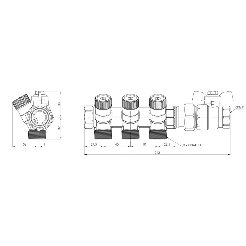 Zestaw podstawowy rozdzielacza do wody użytkowej ADM 203, G3/4'', 3 punkty poboru